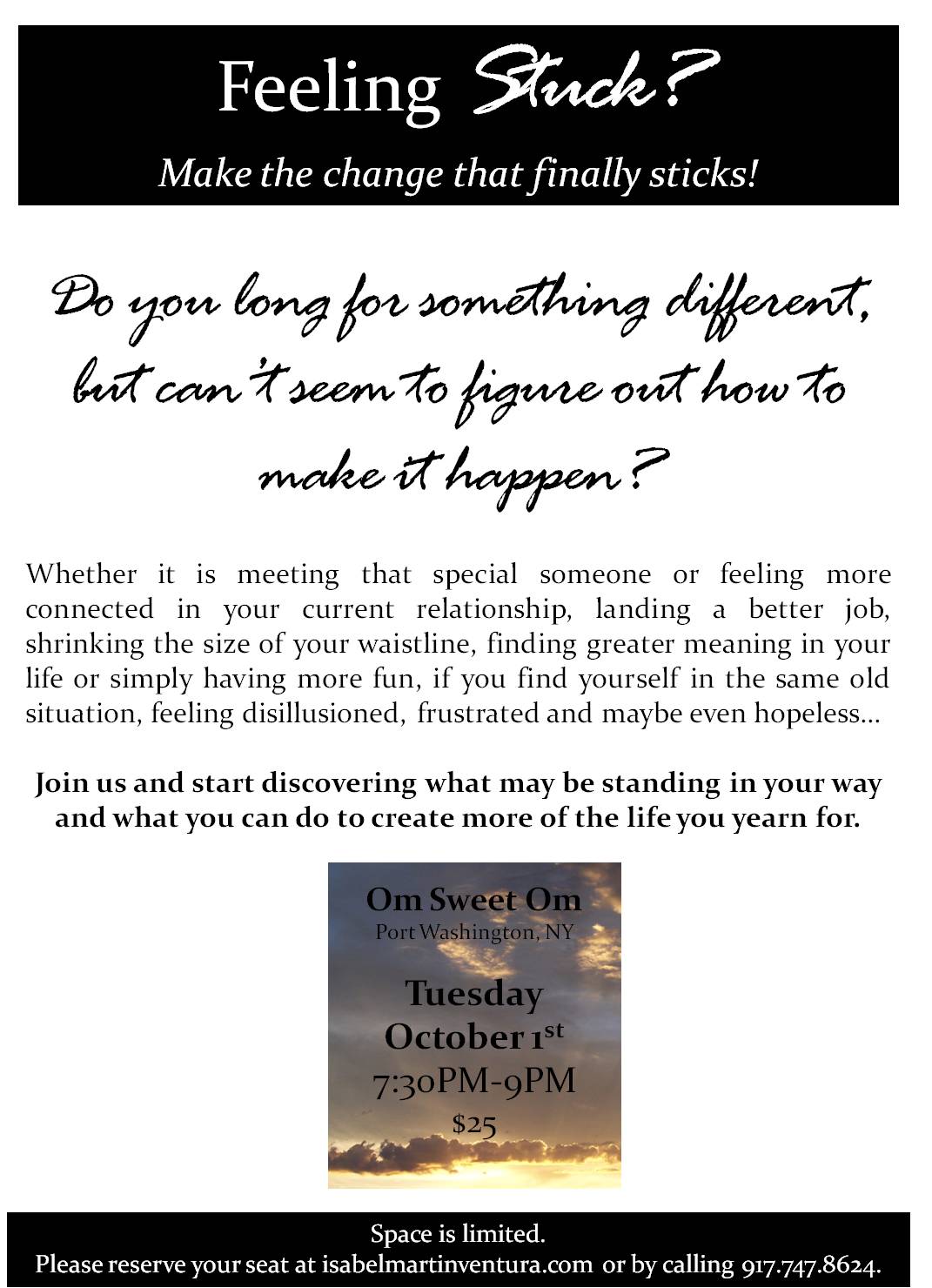 To learn more about making the changes you want, join us at the Feeling Stuck? workshop at Om Sweet Om in Port Washington, NY. Enter your contact information below to reserve your seat. If you cannot attend, share your thoughts. What surprising answers did you discover may be standing in the way of your best life?